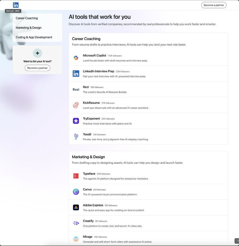 LinkedIn is running a pilot program curating a set of AI tools designed to help professionals across categories like Development/Coding, Design/Marketing, and Career Coaching.
